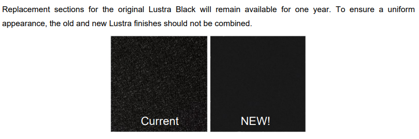 NOTE - As of 1/19/2026 the Lustra BLACK (only) will have a change in texture. Replacement sections for the old texture in black will be available for one year. The 'current' picture below will remain the same for all other colors.